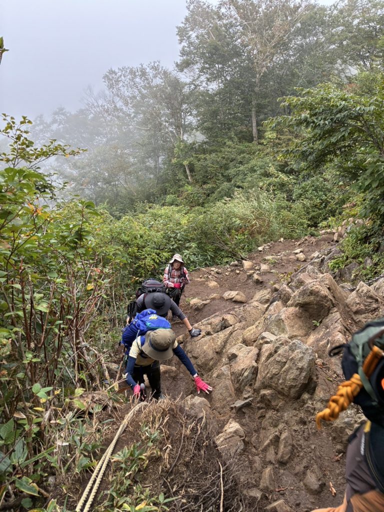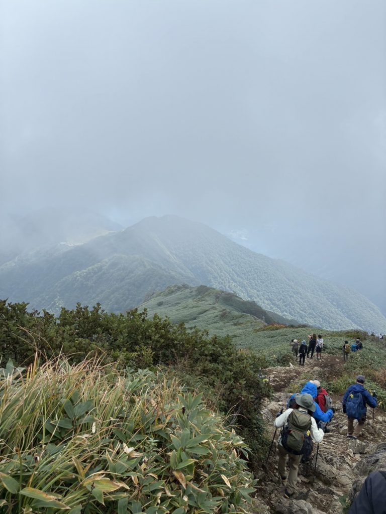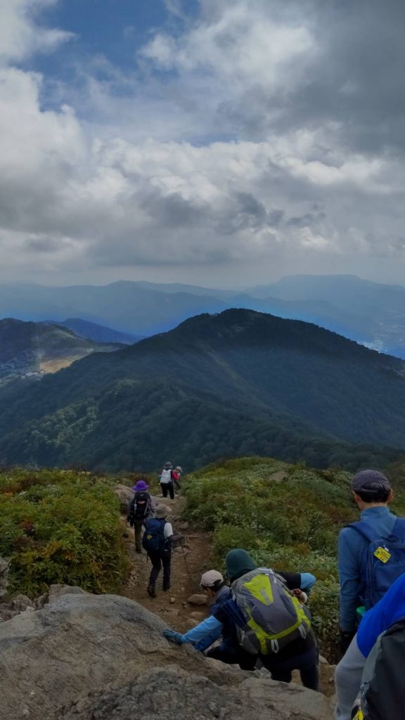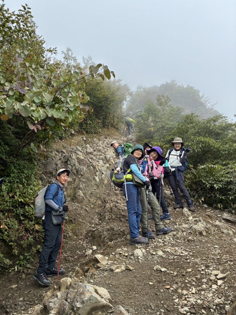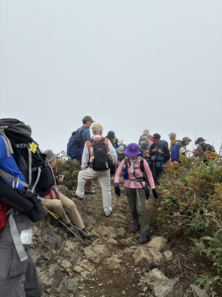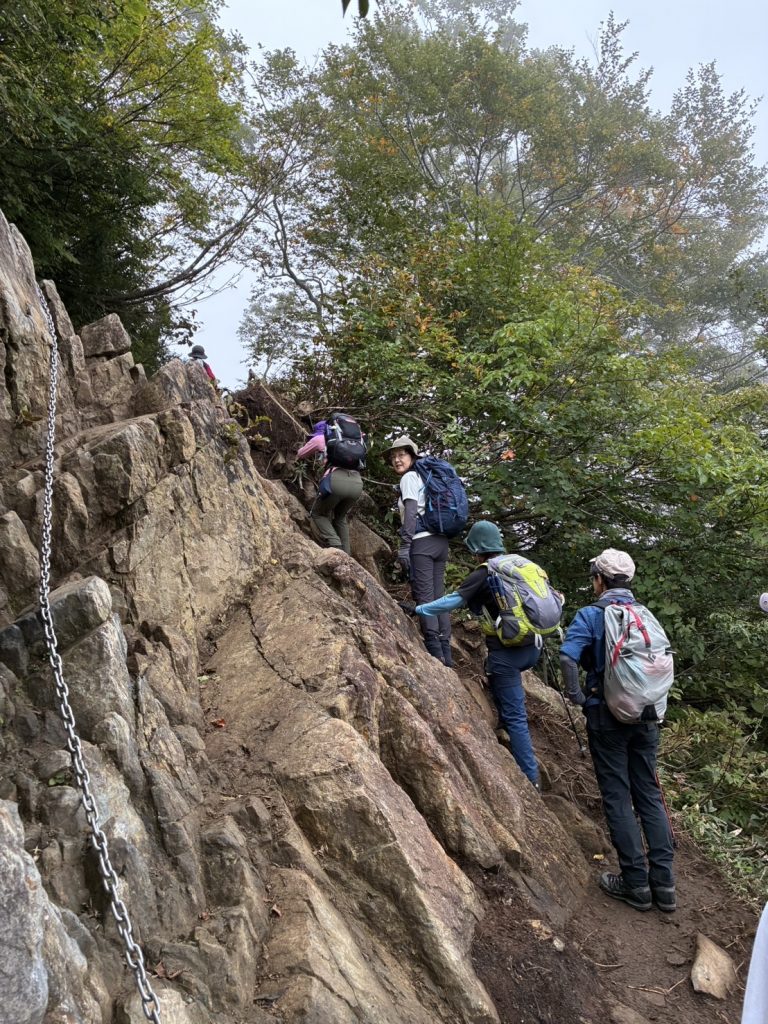谷川岳は日本百名山の一つで、急峻な岩壁と天候が急激に変化することで遭難者が多く「魔の山」と言われる。天気はくもり、ロープウェイに乗ってらくらくと天神平に到着。 「いよいよあの有名な谷川岳登山だ。」と初めての私は胸がわくわくしたものの、こわい気持ちも少々。8名ずつの2班編成だったが、ほぼ離れることなく登って行った。すべりやすい岩に気をつけながら、時々階段のある道を歩いて行くと、真っ赤な外壁の熊沢避難小屋に到着。「ほぼ半分来たよ」と聞いた時は、時計を見て早くて驚いた。 天狗の留まり場で休憩。大岩に登った人からは「景色は見られない」という落胆の声。 「谷川岳は油断したら危険だ!」と気持ちを引き締めて、急峻な岩壁を慎重に登った。みんなが登る様子を下から見上げ、言葉通りであることを実感した。 肩の小屋で休憩、いよいよトマの耳へ。くもっている空を見上げて雨が降らないことを願った。集合写真を撮ったら、隣りに見えるオキの耳へ。あいにく頂上からの眺めは悪く風もあり寒い。もし晴れていたら、山頂から東に燧ヶ岳、日光連山、南に赤城山、榛名山、遠くに富士山、西に苗場山、北に日本海を望む360度の大パノラマが広がるそうだ。近くのクラブ員はそんな絶景を見たことがある。うらやましい。 肩の小屋での昼食、エネルギーのチャージ。その後の下りは、谷川岳の神様が、時たま雲を取っ払ってくれて、すばらしい景色を見せてくれた。登って来た尾根の軌跡や山々の紅葉もはっきりと見ることができ感激した。 今回は頂上からの大パノラマを見ることはできなったけれど、雨に降られることもなく、けが人もなく順調だった。谷川岳の神様、ありがとうございました。ぜひ晴れた日に来て大パノラマを見てみたい。 下山後はすぐ近くの谷川岳山岳資料館を見学し、先人の登山家達の装備や足跡をたどり、多くの写真を見て今回の登山の余韻を楽しんだ。