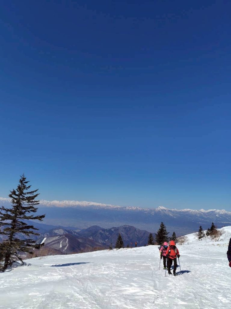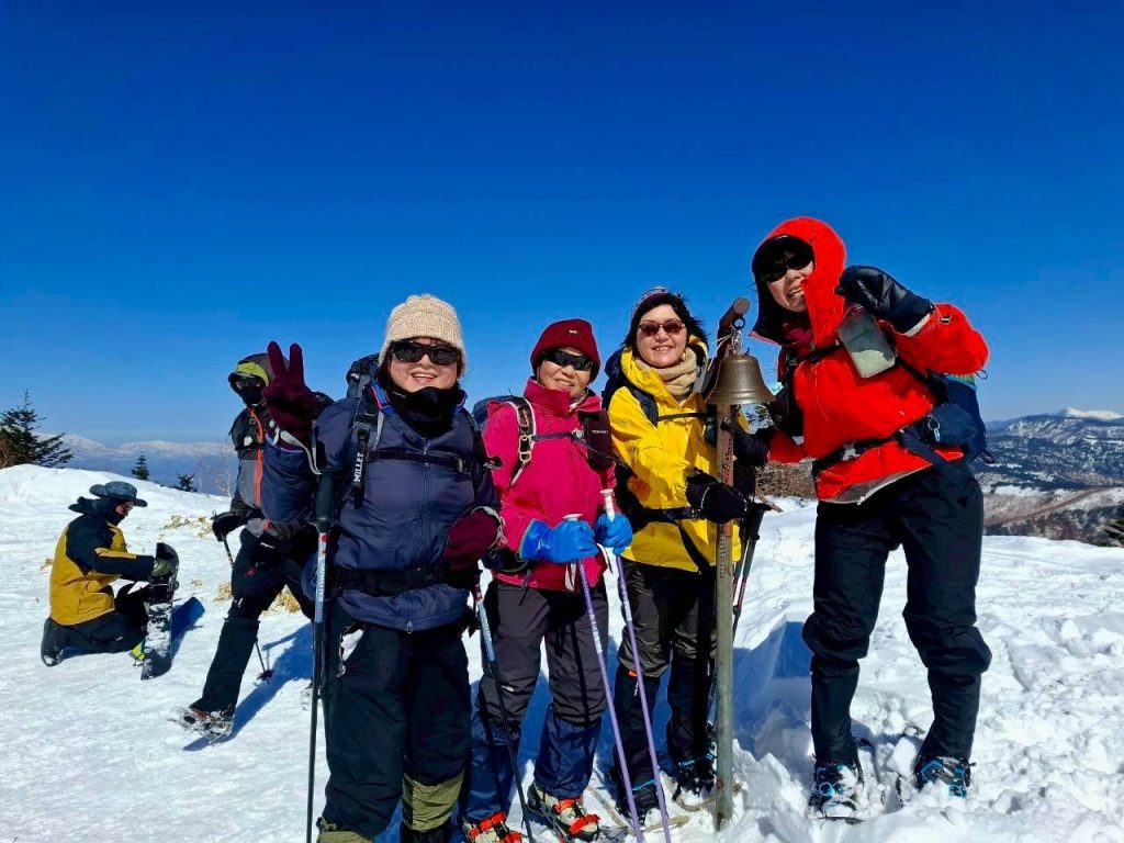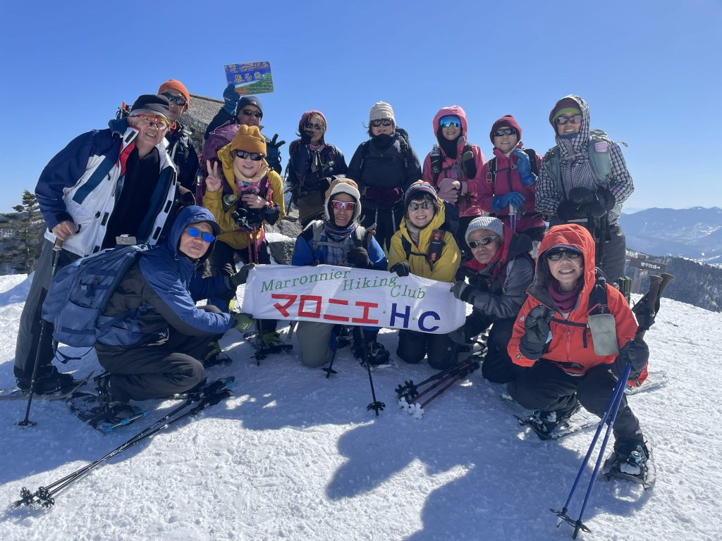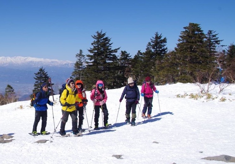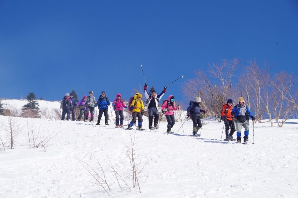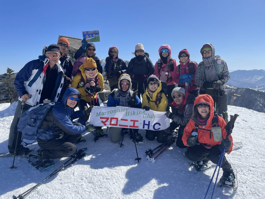 登るにつれ、徐々に傾斜が強くなってきました。スノーシューを引きずる足にも疲労が蓄積されてきました。後ろを振返り北アルプスの展望に背中を押されること数回!皆で元気づけ十数回!!強い仲間意識を感じながら全員登頂する事が出来ました。みんな頑張りました。雲一つない濃い青空が私たちを歓迎しています。みんなの笑顔で一杯です!!!