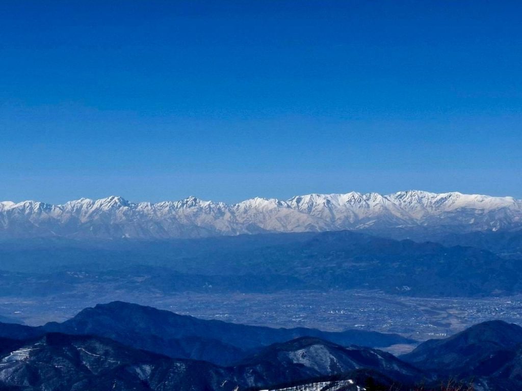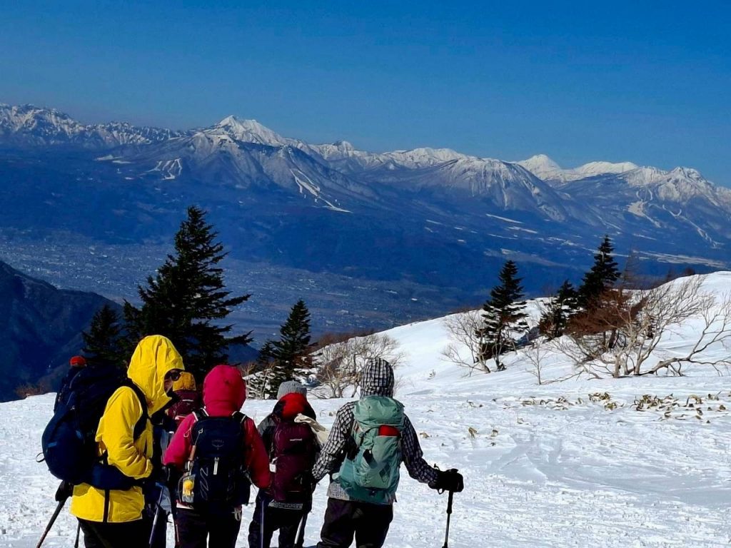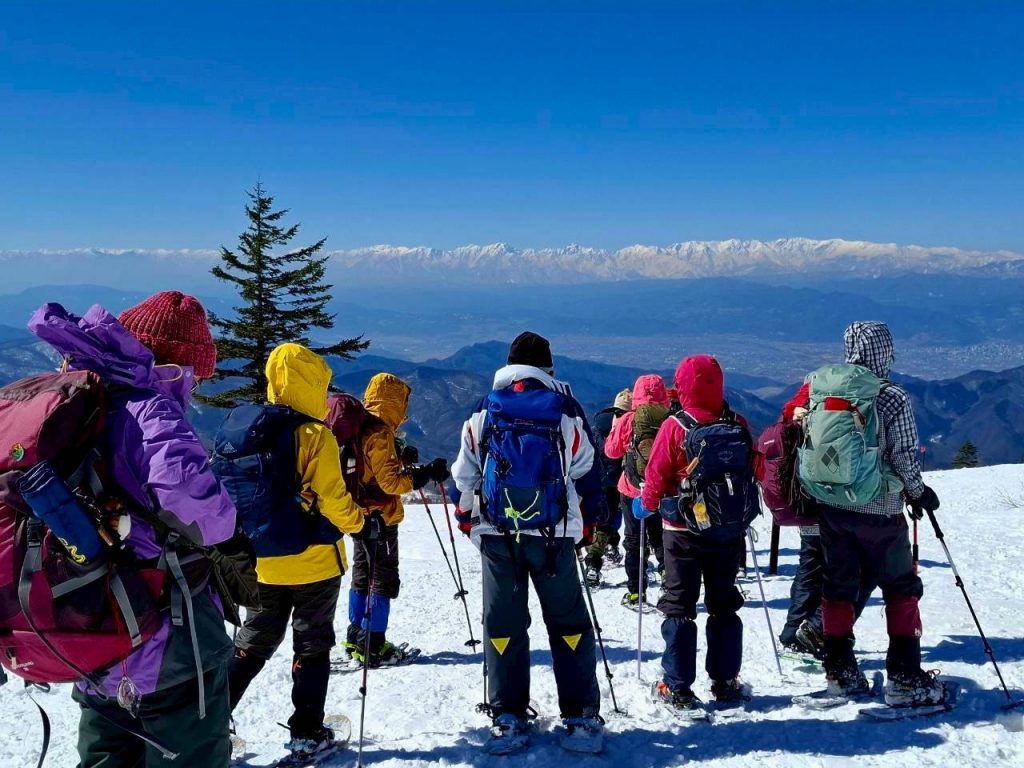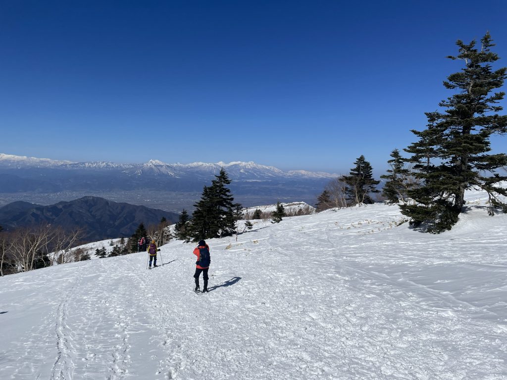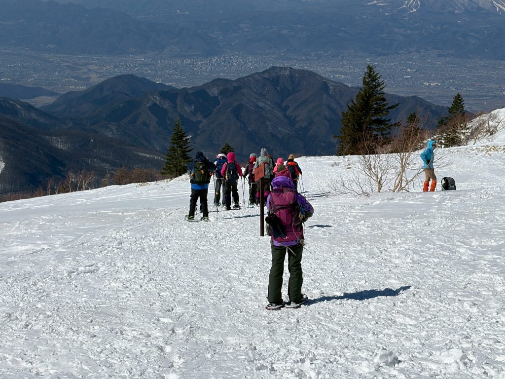 登るにつれ、徐々に傾斜が強くなってきました。スノーシューを引きずる足にも疲労が蓄積されてきました。後ろを振返り北アルプスの展望に背中を押されること数回!皆で元気づけ十数回!!強い仲間意識を感じながら全員登頂する事が出来ました。みんな頑張りました。雲一つない濃い青空が私たちを歓迎しています。みんなの笑顔で一杯です!!!
